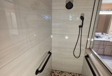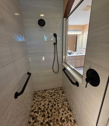 This master bathroom features luxurious marble-look porcelain tiles on the walls paired with marble pebbles on the shower floor, creating a sophisticated and timeless spa-like atmosphere.
